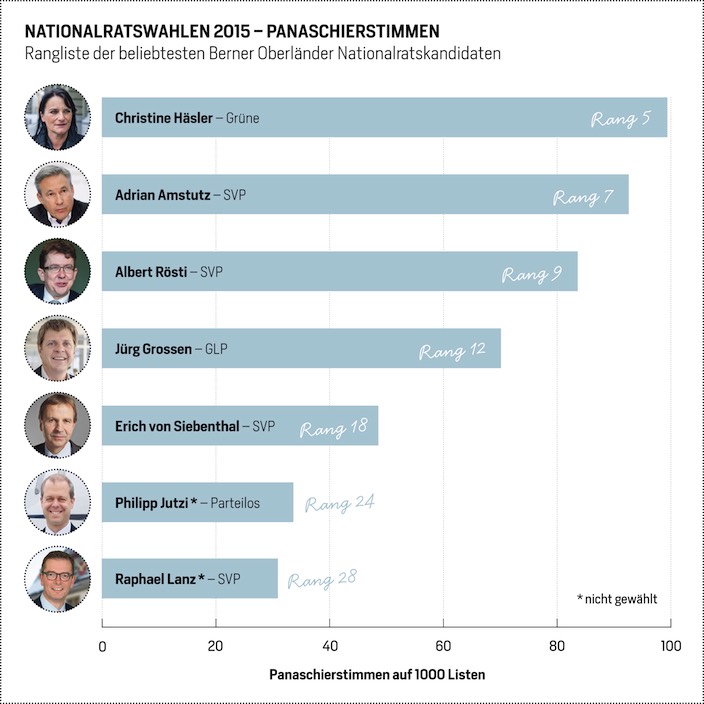 „Kürzlich veröffentlichte Zahlen des Bundesamts für Statistik zu den Panaschierstimmen geben Aufschluss, über die parteiübergreifende Popularität der Nationalratskandidaten. Unter den ersten 30 beliebtesten Politikern befinden sich sieben Berner Oberländer. Christine Häsler führt das Feld an.“
